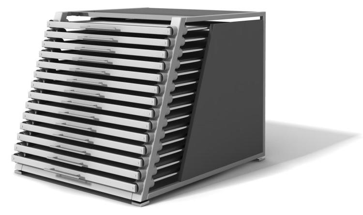 TECHNISCHE DATEN Breite / Tiefe / Höhe - 1100 x 1300 x 1000 mm ausgezogen - 2000 mm Auszüge - 14 Metallrahmen 925 x 925 mm Tafelformat - 14 Mustertafeln 920 x 920 mm Führungsrohr - Edelstahl, 16-fach kugelgelagert Belastung - PREMIUM - max. 60 kg Belastung - SOLID - max. 100 kg (*) Ablageplatte - Spanplatte, Dekor, beschichtet Seitenplatte - Spanplatte, Dekor, beschichtet Rückwand - Spanplatte, Dekor, beschichtet (*) Farbgestaltung - siehe Kundendienst / Dekore (*) - Sonderausstattung gegen Aufpreis
