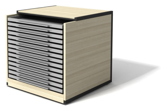 TECHNISCHE DATEN Breite / Tiefe / Höhe - 1050 x 1100 x 1000 mm ausgezogen - 1800 mm / 2050 mm Auszüge - 14 Metallrahmen 925 x 925 mm Tafelformat - 14 Mustertafeln 920 x 920 mm Führung - Teilauszug / Rollenführung Belastung - COMPACT - max. 40 kg Führung - Vollauszug / Schwerlastauszug Belastung - SOLID - max. 100 kg Ablageplatte - Spanplatte, Dekor, beschichtet Seitenplatte - Spanplatte, Dekor, beschichtet Rückwand - Spanplatte, Dekor, beschichtet (*) Farbgestaltung - siehe Kundendienst / Dekore (*) - Sonderausstattung gegen Aufpreis